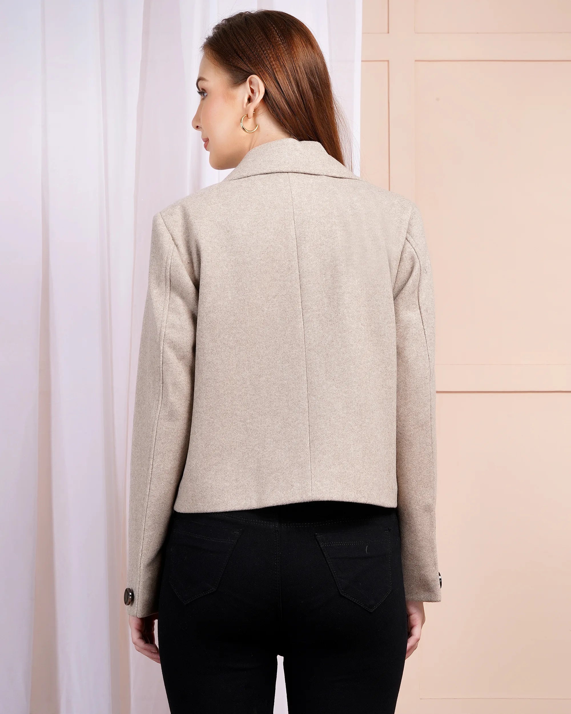 Fabric & Color: Warm wool-blend in neutral beige – versatile and easy to style Design & Features: Double-breasted button closure...